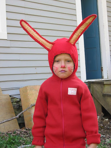 Actually, he had a lot of fun in it, and I got a little taste of what my mom would probably call "payback" for all the ridiculous sewing I made her do for my Halloween costumes through the years. I sewed pieces of felt to his wool balaclava, whilst trying to make sure I'll be able to take it all apart later (as the balaclava is an essential item in a child's wardrobe about eight months out of the year here), and ran wire through the ears. The intention was to be able to pose the ears in a floppy way, but they were so hilarious standing straight up that I just had to leave them that way.